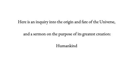 Before the reader begins, I encourage them to enter the mindset of what a philosopher once called sub specie aeternitatis—from the perspective of eternity.2 Let us take a seat outside of space and time, beyond the edge of the Universe, so that, looking down, we can see all of Creation, from the beginning of time to the end.
